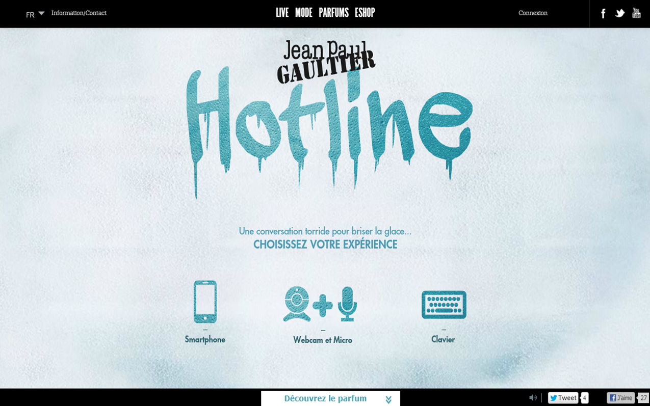 La maison Jean-Paul Gaultier nous propose une nouvelle plateforme de marque à l’occasion de la sortie de son nouveau parfum « Le Beau Male ». La plateforme propose aux internautes de tester leur pourvoir de séduction via des interactions gestuelles, visuelles et vocales.